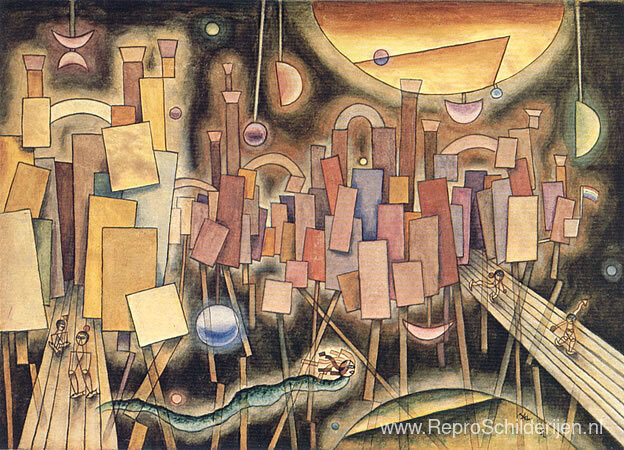 Wij bieden u een ambachtelijke reproductie op doek van het beroemde schilderij 'Paleis Almi ' van Xul Solar, afkomstig uit het Reproductiemuseum.