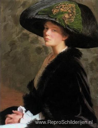 Wij bieden u een ambachtelijke reproductie op doek van het beroemde schilderij 'De Groene Hoed' van Lilla Cabot Perry, afkomstig uit het Reproductiemuseum.
